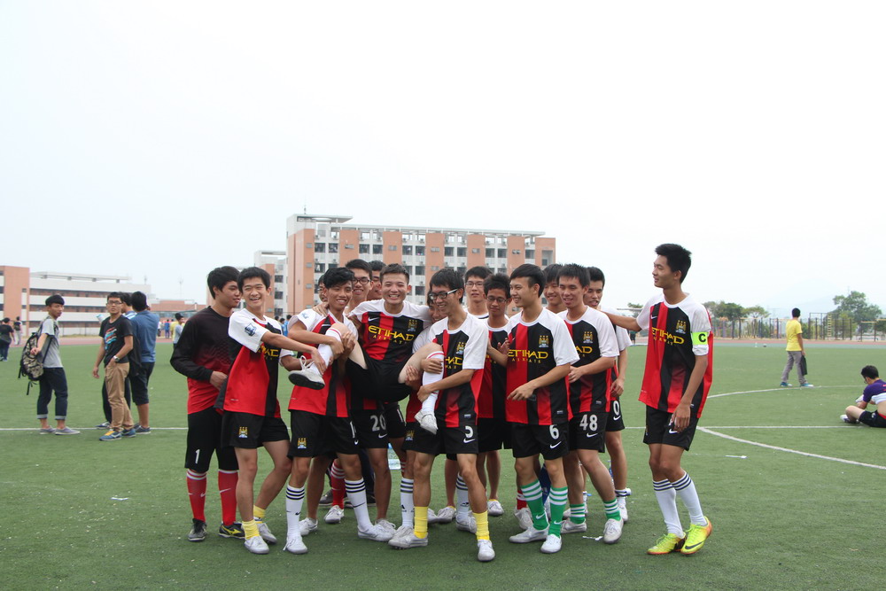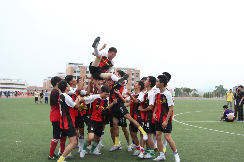 中午12:20,土建联队的14名队员已经到达球场,一个个意气风发、自信满满,队长组织所有队员跑步、拉筋等一系列热身之后,大家都摩拳擦掌,期待即将到来的比赛。对方队员们也在忙于热身,不甘示弱。渐渐地,球场边陆陆续续来了很多建筑学院和土木工程学院的同学前来加油助阵,土建队员们士气也逐渐高涨起来。随着一声哨响,双方选手入场,1点整,比赛开始!开场不到10分钟,土建联队队长邓建业在稍过半场的位置凭借精湛的脚法,一球踢进对方球门死角,锁定上半场比分1:0,顿时全场欢呼。下半场开场约15分钟,土建联队拿到一个角球机会,队长邓建业头球攻门,梅开二度,拿到开赛以来第四球。离下半场结束仅剩5分钟时,土建联队射手李志铮单刀突破打门,锁定正常比赛最终比分3:0,这也是他开赛以来拿到的第六球,土建联队进入了决赛。此外,今天还是射手李志铮的生日。比赛结束后,土建队员们一起举起李志铮高抛,队员们似乎意犹未尽,又抱起李志铮阿鲁巴,气氛热烈,体现了球员之间的深厚情谊。