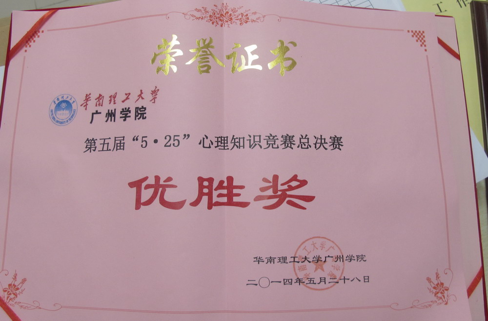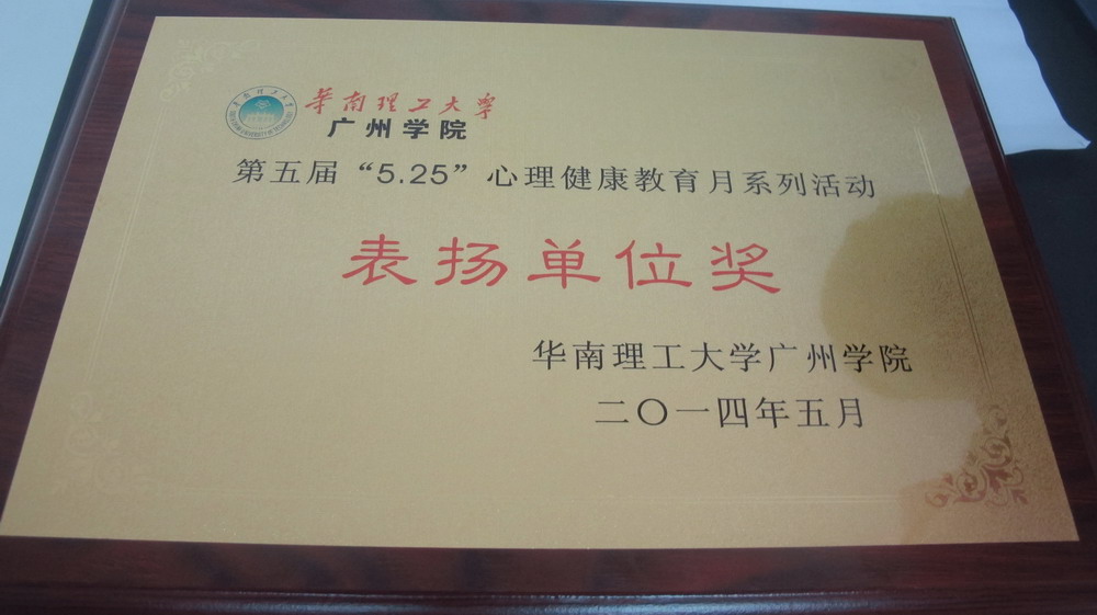 根据华广学〔2014〕22号 关于表彰第五届“5•25”心理健康教育月系列活动先进集体与先进个人的决定,建筑学院学生代表队获得“心理知识竞赛活动团体奖”优胜奖,建筑学院获得“系列活动总体奖”表扬单位奖。