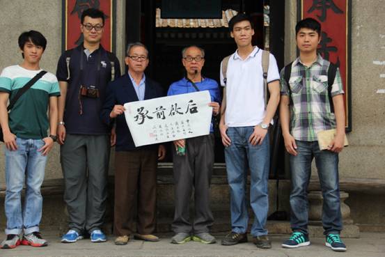 之后,项目组来到“友兰公祠”,其中堂有“接旨亭”,是友兰公为其父黄皞与兄黄学准“父子两乡贤”接圣旨而建的,实属广府罕有!亭内悬挂的横匾“芳徽克绍”寓意美好的品格能得以继承。周展恒认为:承传,乃古村文化得以历久弥新的精髓,故最后选择在友兰公祠门前,呈赠事先草创的书法一幅——承前启后,作为对老先生倾情讲解的答谢;对古村诚心的祝福;也作为团队今后努力的方向!