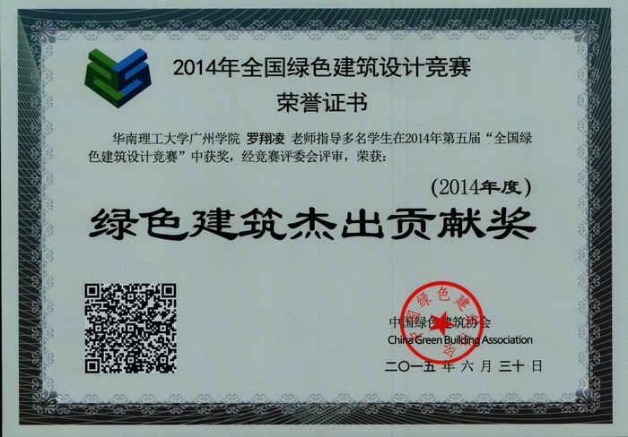 6月,罗翔凌指导的学生(黄创忠,朱梓坚)作品《红山村文化茶馆》在“2014年全国绿色建筑设计竞赛”中荣获浅绿组“优秀奖”,卢文俊同学被评位“最佳活动负责人”,罗翔凌老师在“2014年全国绿色建筑设计竞赛指导排名”中荣获第13名,获得“绿色建筑杰出贡献奖”,学校荣获第16名。