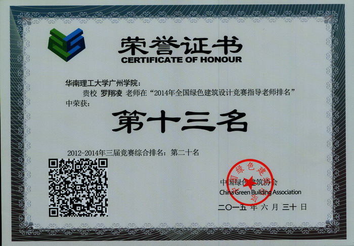 6月,罗翔凌指导的学生(黄创忠,朱梓坚)作品《红山村文化茶馆》在“2014年全国绿色建筑设计竞赛”中荣获浅绿组“优秀奖”,卢文俊同学被评位“最佳活动负责人”,罗翔凌老师在“2014年全国绿色建筑设计竞赛指导排名”中荣获第13名,获得“绿色建筑杰出贡献奖”,学校荣获第16名。