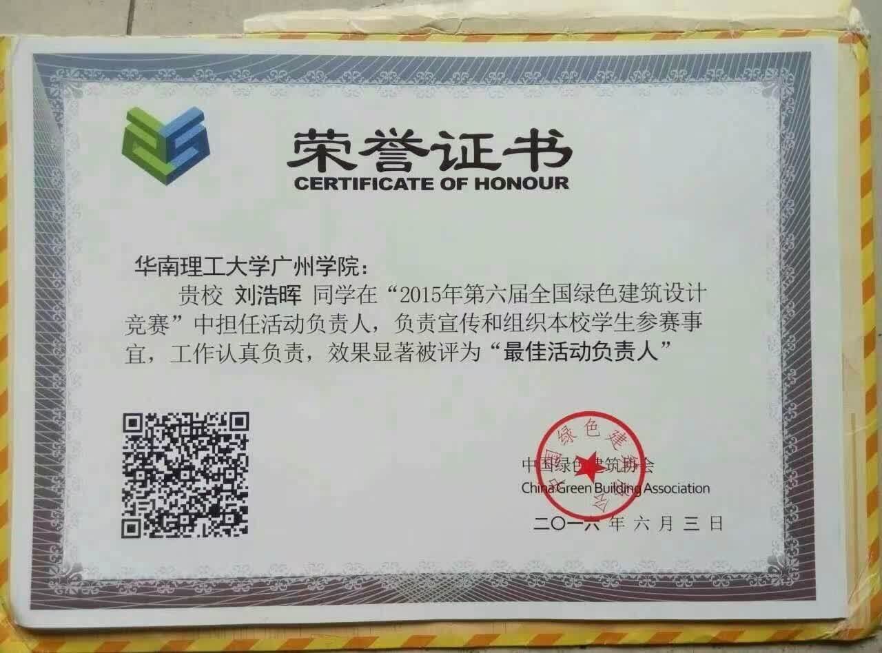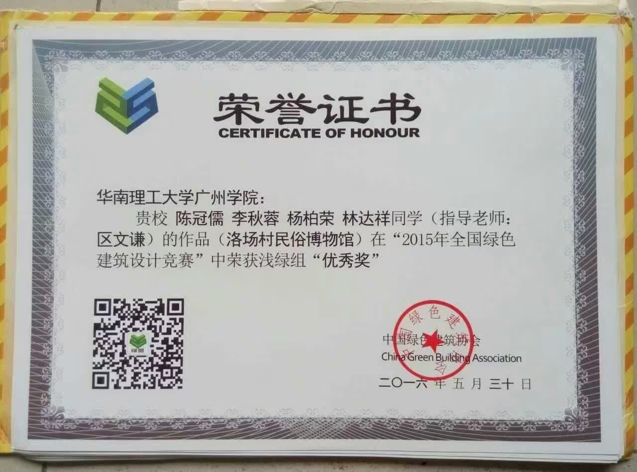 在2015年全国绿色建筑设计竞赛中,区文谦指导的学生(陈冠儒,李秋蓉,杨柏荣,林达祥)作品及刘佳琼指导的学生(程晴,覃文倩,邓诗林,谭文杰)作品荣获浅绿组“优秀奖”,区文谦获得“十佳绿色园丁奖”,刘浩晖同学被评为“最佳活动负责人”。