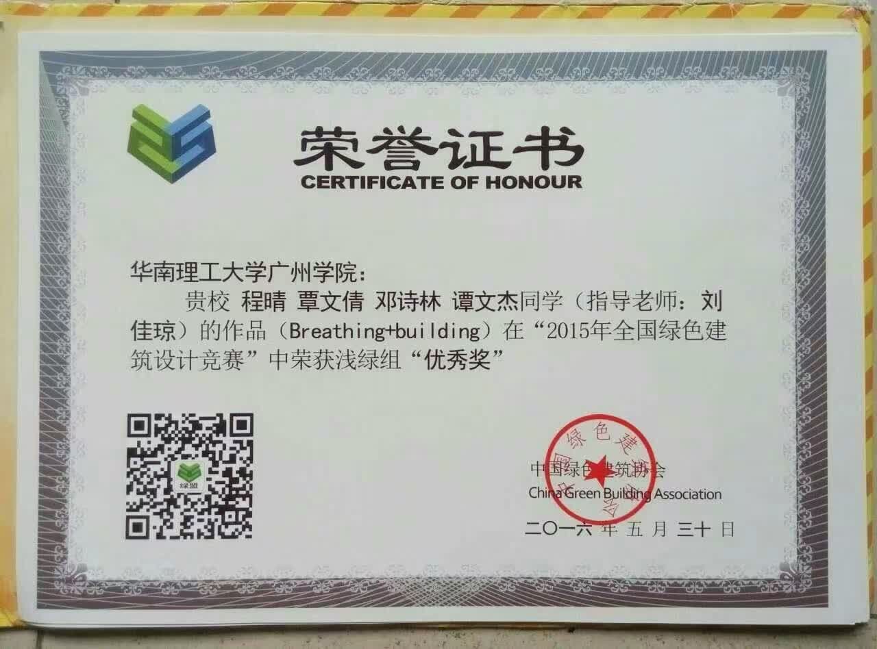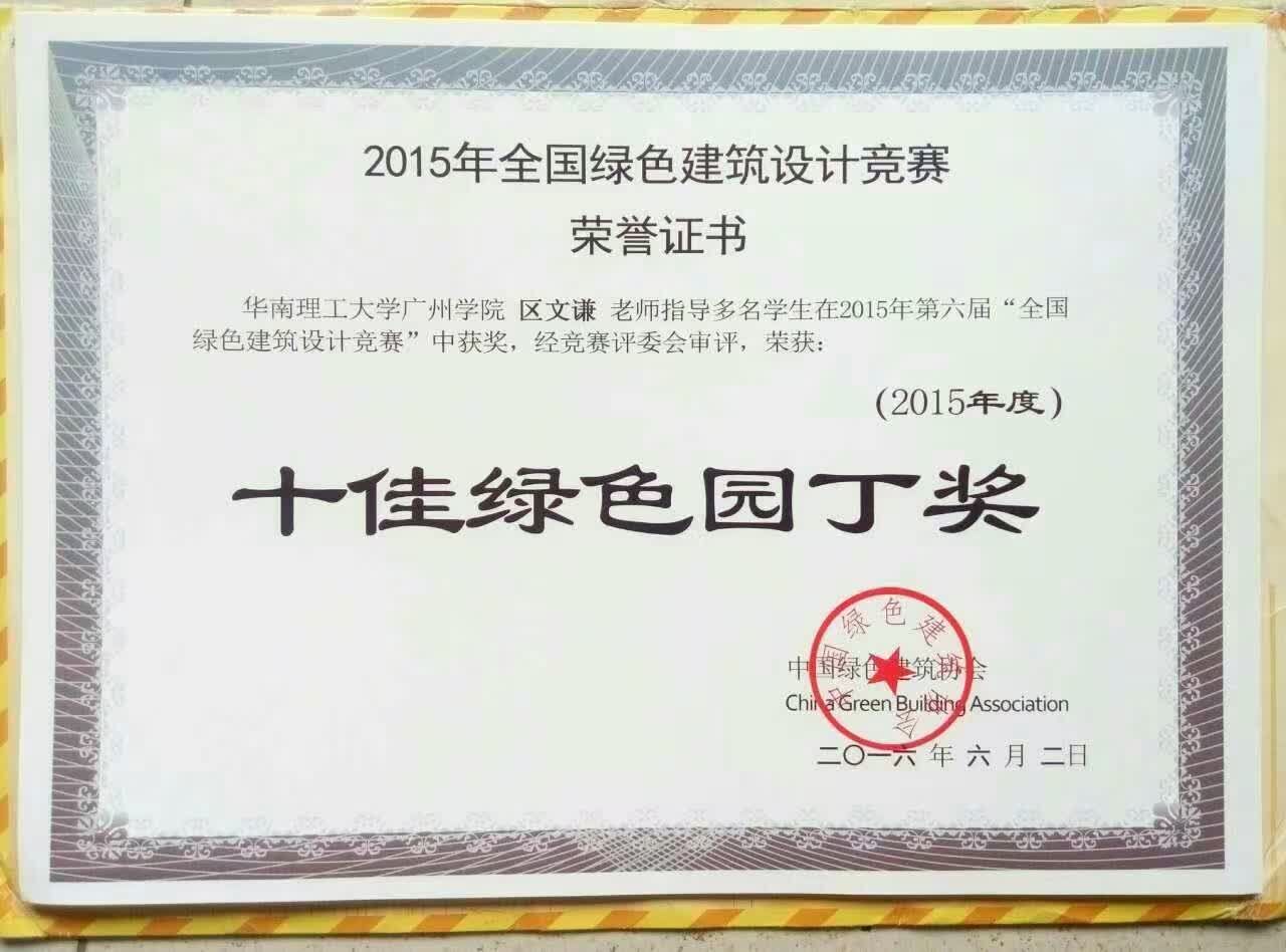 在2015年全国绿色建筑设计竞赛中,区文谦指导的学生(陈冠儒,李秋蓉,杨柏荣,林达祥)作品及刘佳琼指导的学生(程晴,覃文倩,邓诗林,谭文杰)作品荣获浅绿组“优秀奖”,区文谦获得“十佳绿色园丁奖”,刘浩晖同学被评为“最佳活动负责人”。