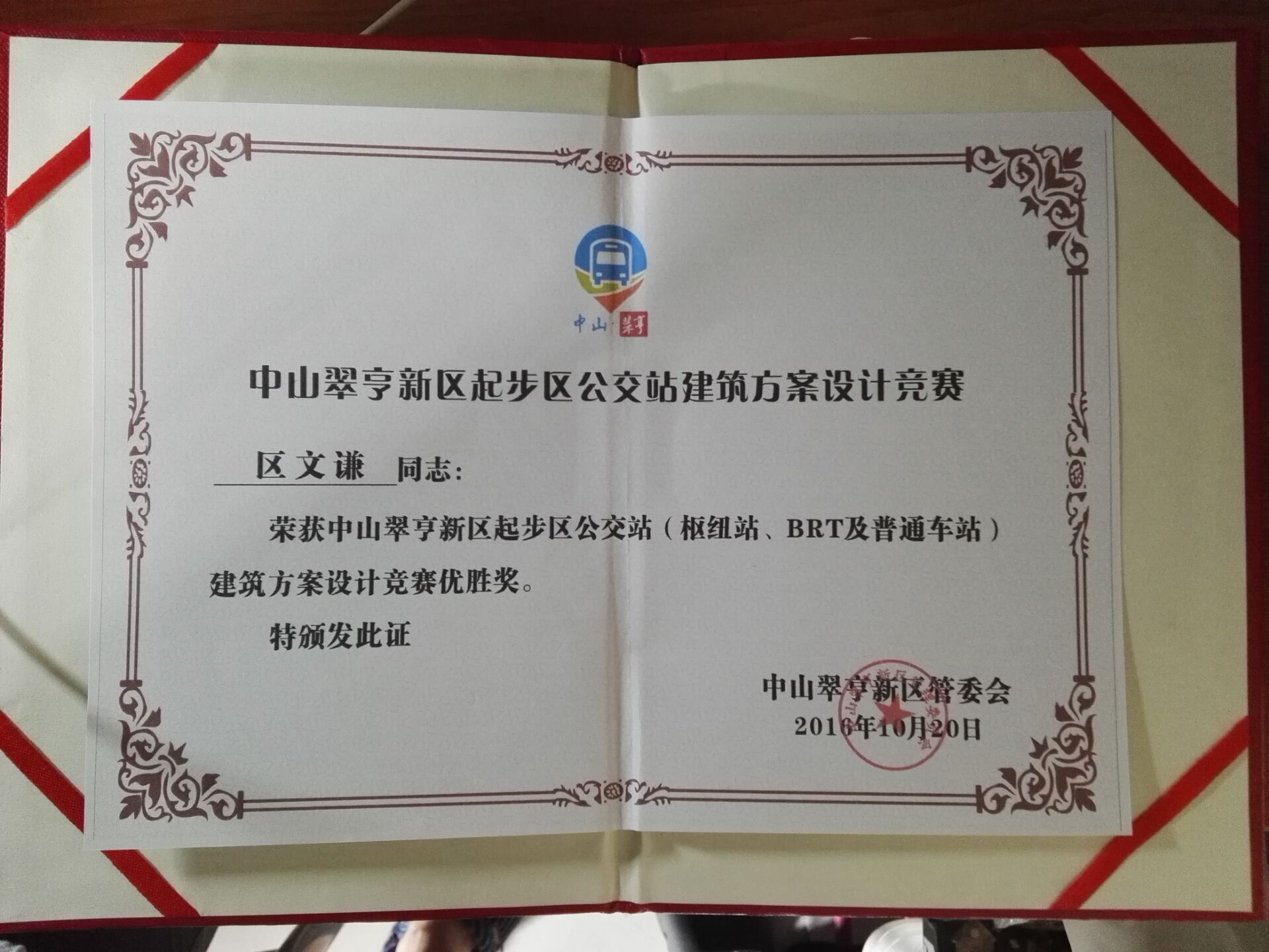 10月,在中山翠亨新区起步区公交站建筑方案设计竞赛中,区文谦指导的学生(赖森媚、廖伟潮、梁伟杰)作品获得竞赛优胜奖。