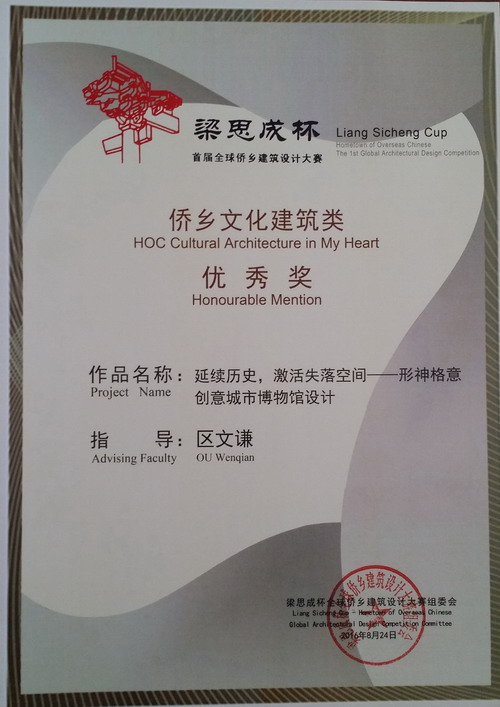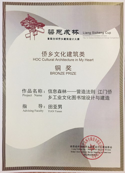 8月,在梁思成杯首届全球侨乡建筑设计大赛中,学院师生报送的5件参赛作品,从全球169件作品中脱颖而出,全部获奖。其中区文谦指导的学生作品《B·2·P - Book to Person 侨乡骑楼改造·分散式图书馆·功能置换·系统组织》(杨嵘峰、陈佳瑜)、田亚男指导的学生作品《信息森林:营造法则》(朱梓坚、马泽铭)在“我心中的侨乡文化建筑”主题组中分别获得铜奖,该组的三项铜奖作品中,学院包揽了两席;区文谦指导的学生作品《延续历史,激活失落空间——形神格意》(卢文俊、赖杰贵)、《江门长堤图书馆设计——侨•栖之也》(李广宪)也在该主题组中分别拿到了优秀奖。宫晨指导的学生作品《散落于乡村的庭院》(李铭峰)在“我心中的侨乡乡村民居”主题组中获得优秀奖。