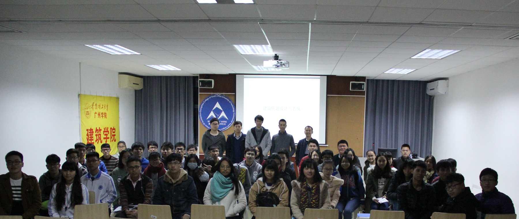 本网讯(记者 陈磊磊)12月27日晚,建筑学院联合广州群瑛文化发展有限公司在A10中庭会议室举办了“快题设计与表现”的专题讲座,群瑛文化公司许树贤老师、华工建筑学硕士研究生陈颖、广东工业大学建筑学硕士研究生黄豪和陈楚权以及我校建筑学院50余名学生参加了本次讲座。