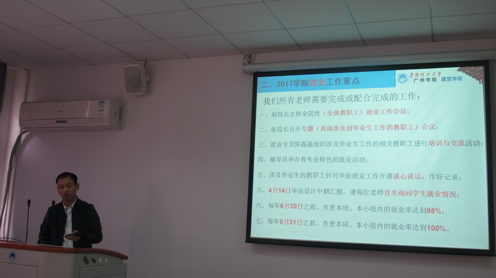 会上,建筑学院院长赵红红重申了与学校签订的就业工作“责任书”,就业工作必须全院师生一同努力。另外,赵红红院长根据与各企业交流反馈信息,分析了今年的就业整体形势,期望老师们能够按照张院长的安排,认真负责的为学生就业服好务,尽量争取每一位学生都能顺利就业。