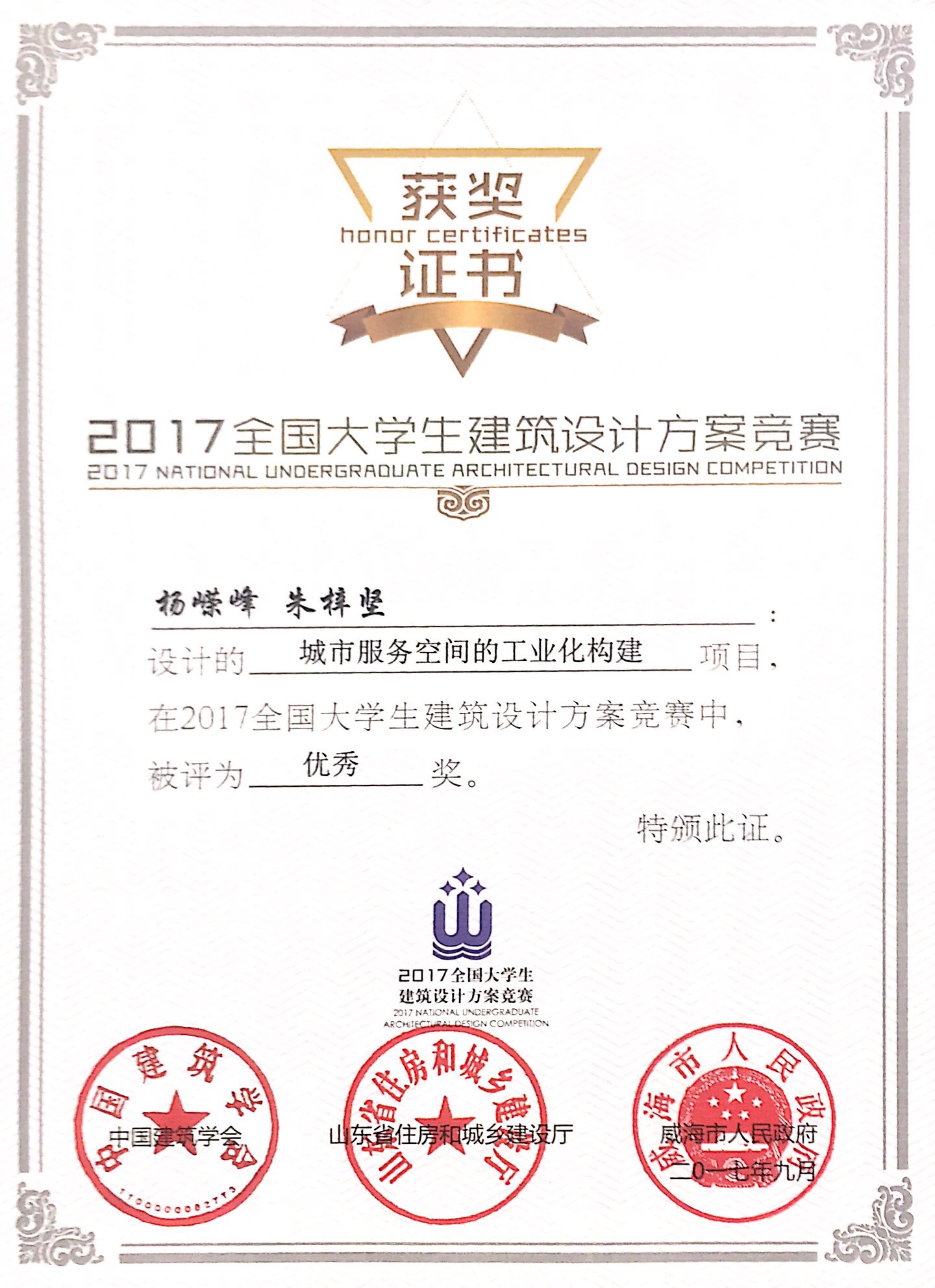 建筑学院2012级学生杨嵘峰、朱梓坚作品《城市服务空间的工业化构建》在第九届中国威海国际建筑设计大赛中获得优秀奖。