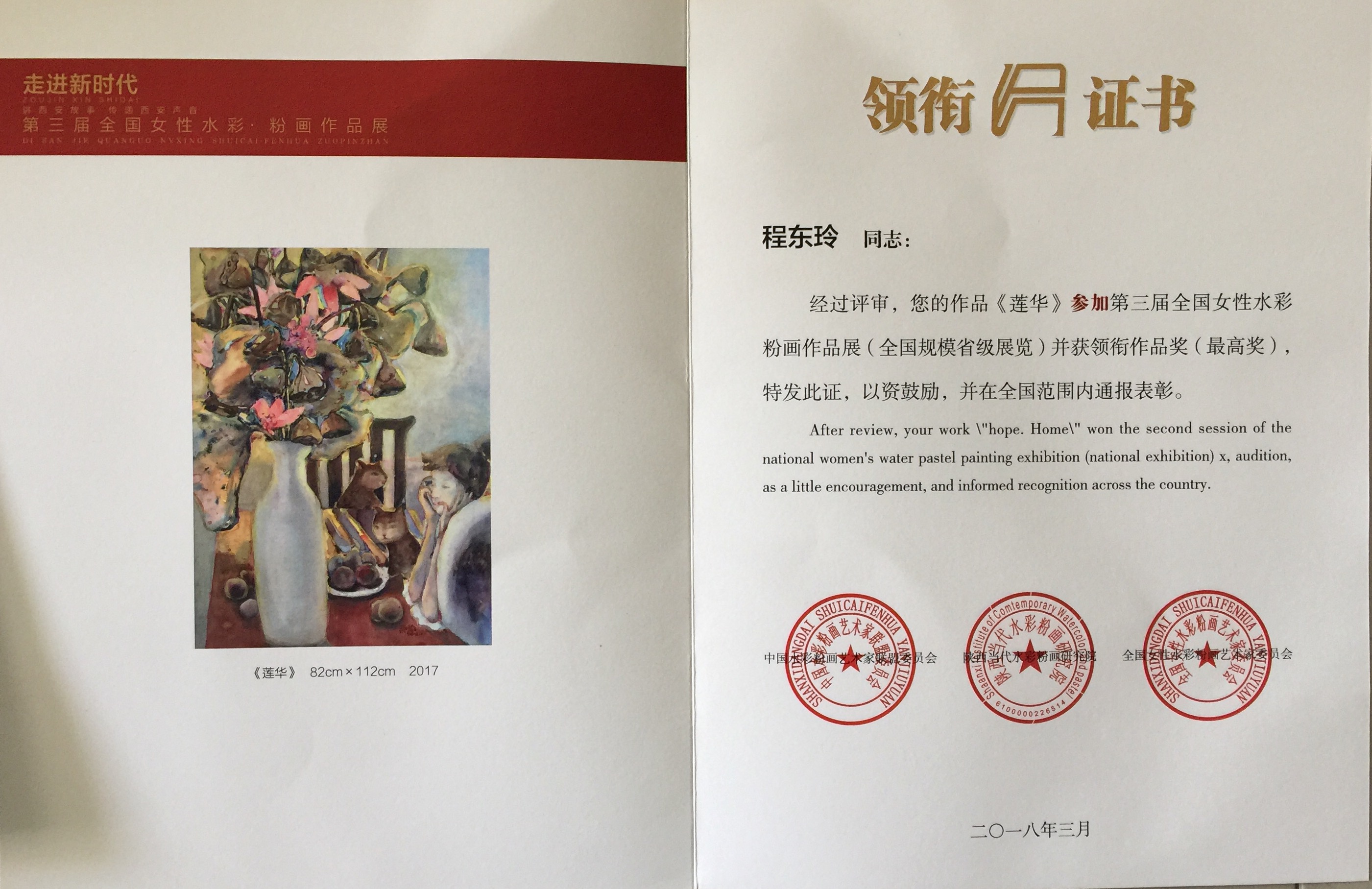 2018年3月,程东玲作品<莲华>参加第三届全国女性水彩粉画作品展(全国规模省级展览)并获领衔作品奖(最高奖)。