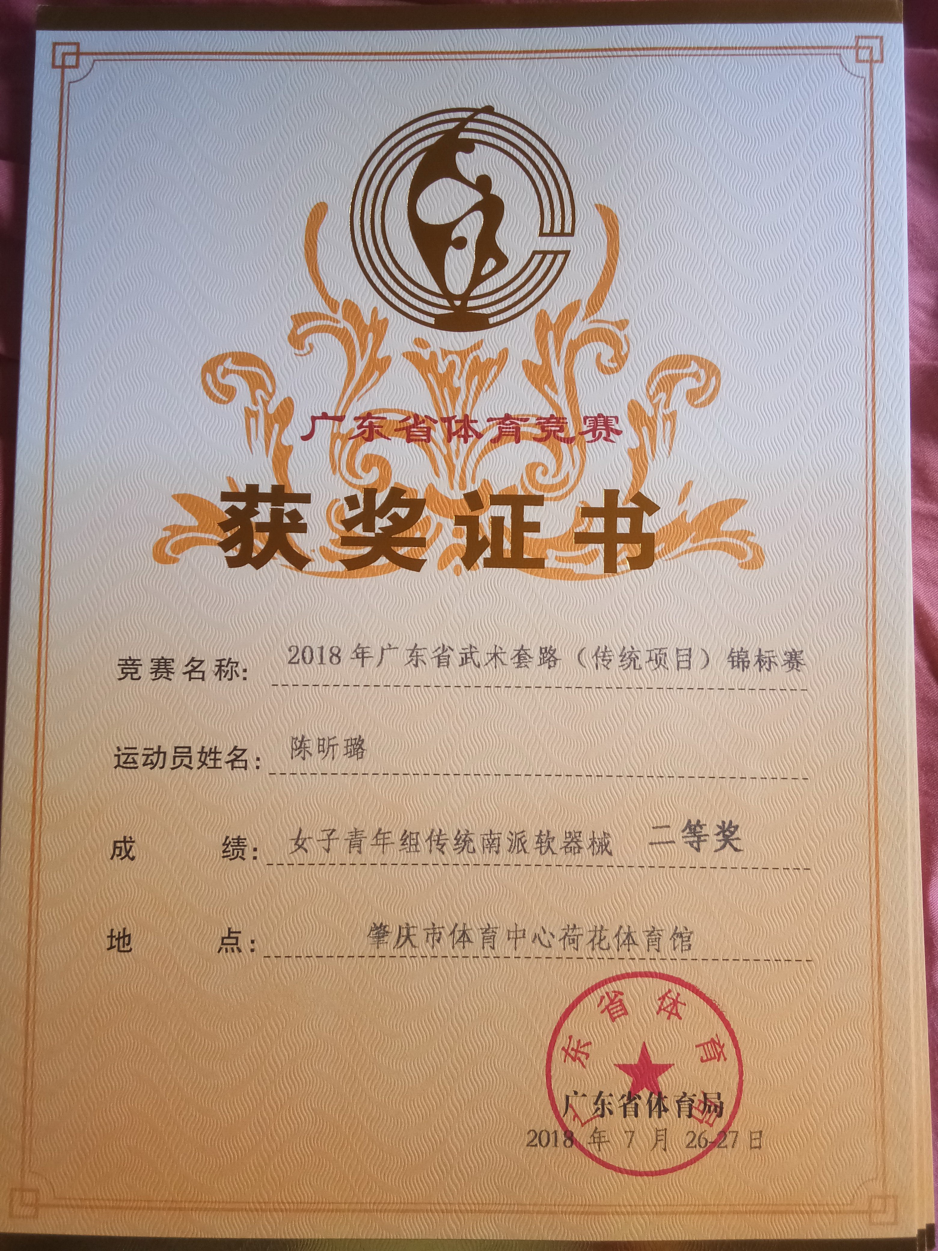 陈昕璐在2018年广东省武术套路(传统项目)锦标赛获二等奖