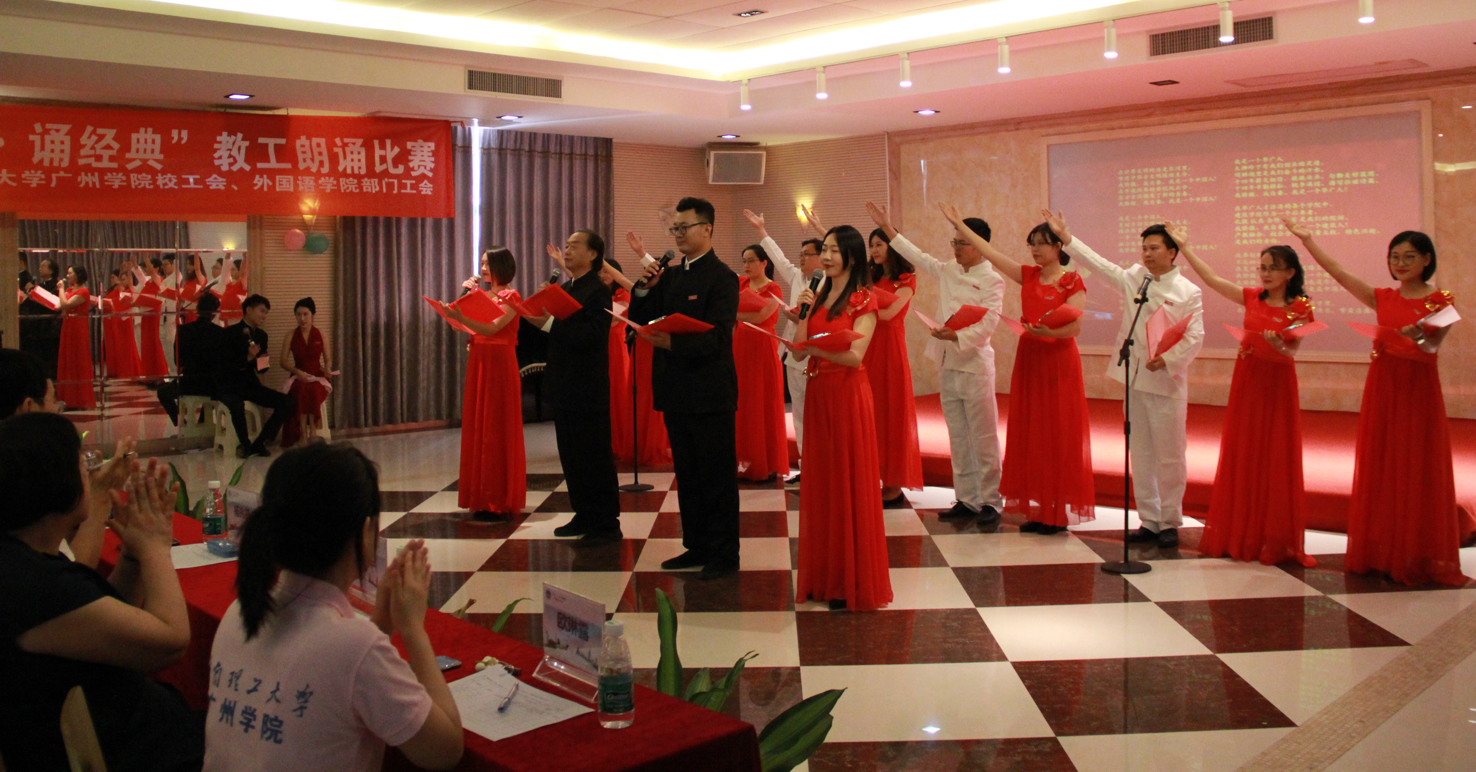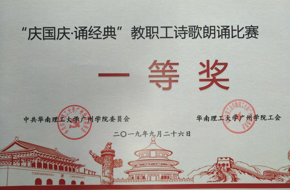 为迎接祖国70周年华诞,9月26日下午,学校党委、校工会举办以“庆国庆•诵经典”为主题的教职工团体朗诵比赛,我院教工积极参与,工会参赛节目《我们是华广建筑人》表现出色,赢得了评委和观众的一致好评,获得大赛一等奖。