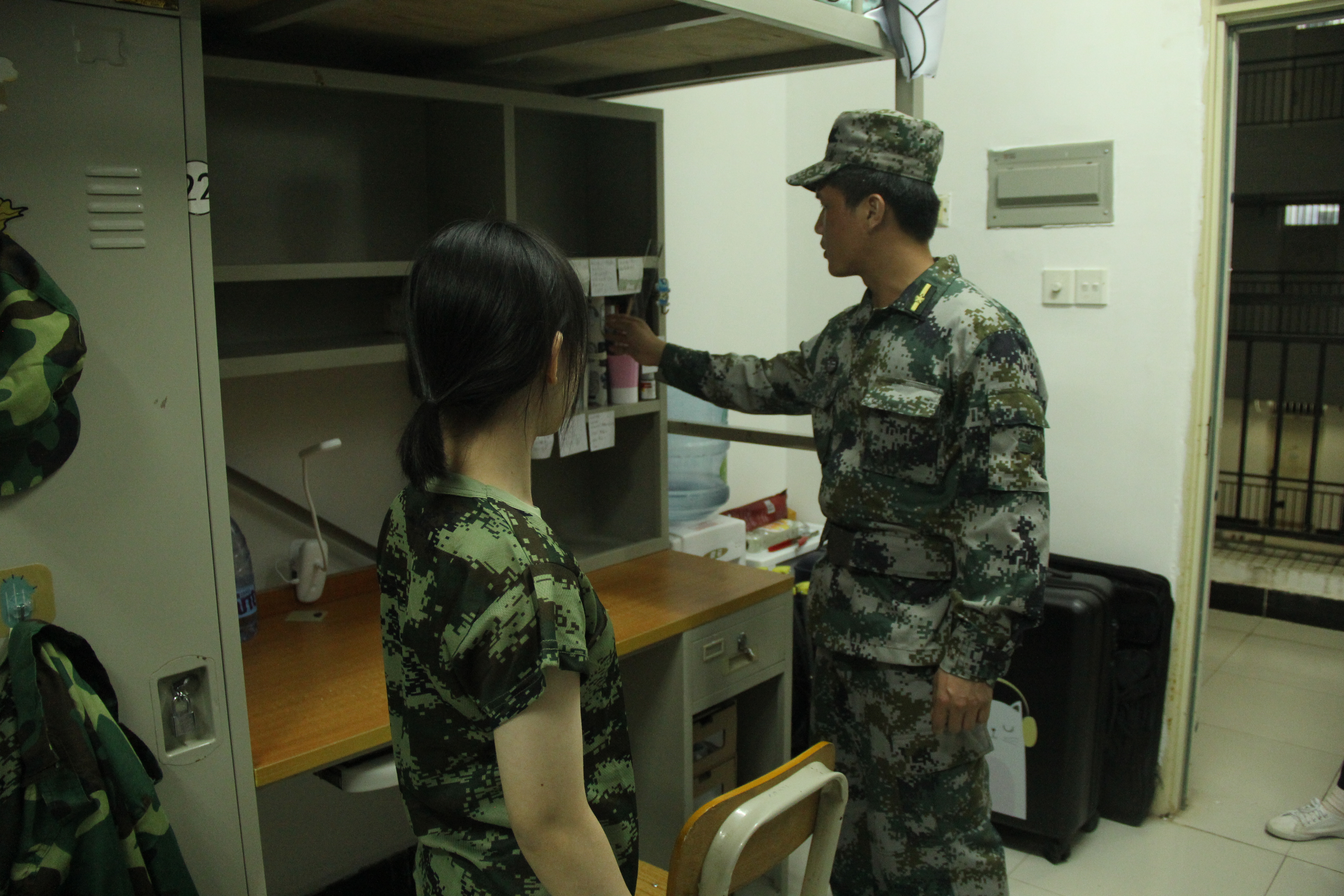 怀揣着忐忑的心情,同学们在宿舍等候着教官的检查。锃亮的地板,洁净的阳台,书架上整齐排列的书本,如同白日里新生们站军姿的队列。