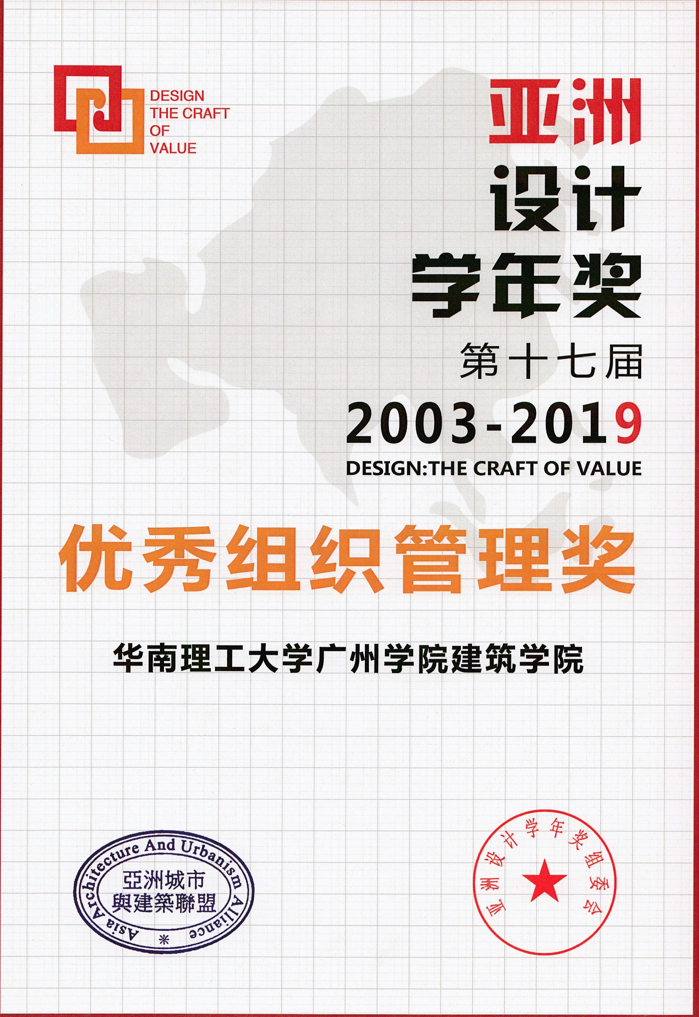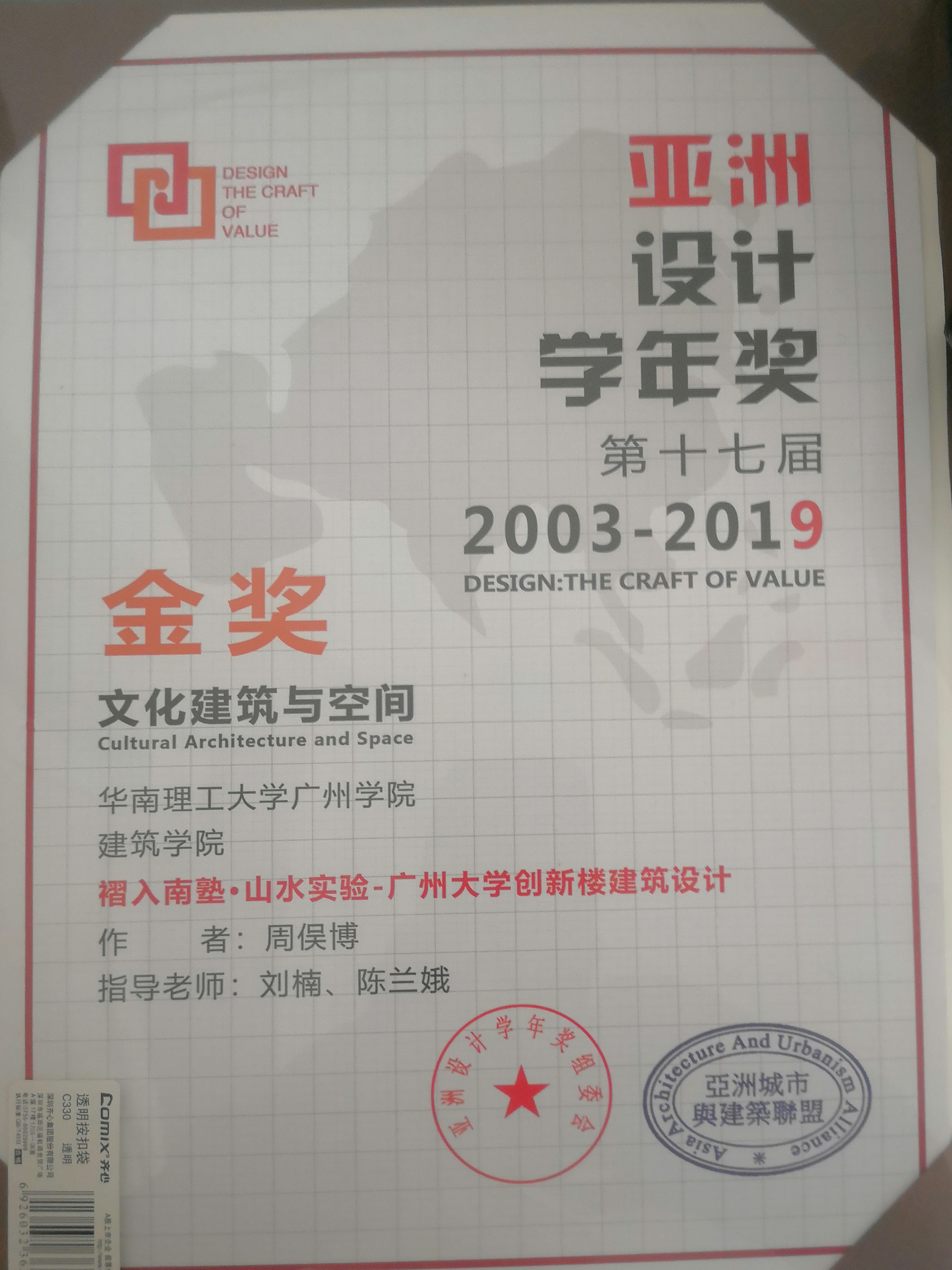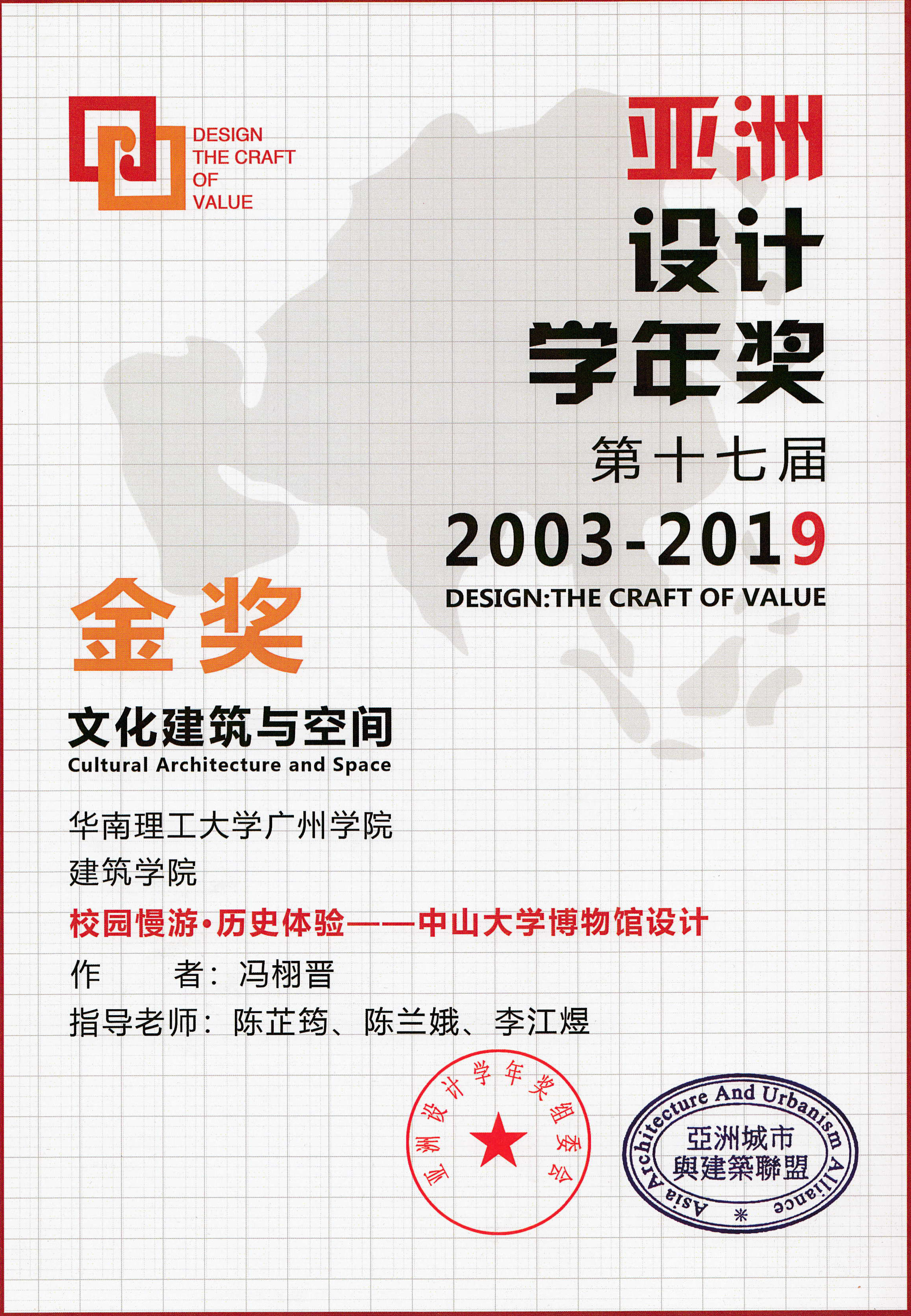 亚洲设计学年奖由亚洲城市与建筑联盟、亚洲设计学年奖组委会、中国建筑学会主办,是国内高校环境设计领域最高奖项。2019年该赛事吸引了悉尼大学、清华大学、同济大学、中国美术学院、东南大学、天津大学、华南理工大学等国内外近600所高校参与,送交参赛作品多达7000份,评委由国际院校建筑环境设计领域的权威专家组成,参赛作品经重重海选,竞争激烈,获奖难度高。我校建筑学院陈芷筠、陈兰娥、李江煜老师指导、冯栩晋同学作品《校园慢游·历史体验——中山大学博物馆设计》获得“文化建筑与空间类”金奖,刘楠、陈兰娥老师指导、周俣博同学作品《褶入南塾·山水实验——广州大学创新楼建筑设计》获得“文化建筑与空间类”金奖,陈芷筠、陈兰娥、李江煜、刘楠、刘佳琼获得优秀指导教师奖,参赛获奖者将被纳入亚洲城市与建筑联盟设计人才库。