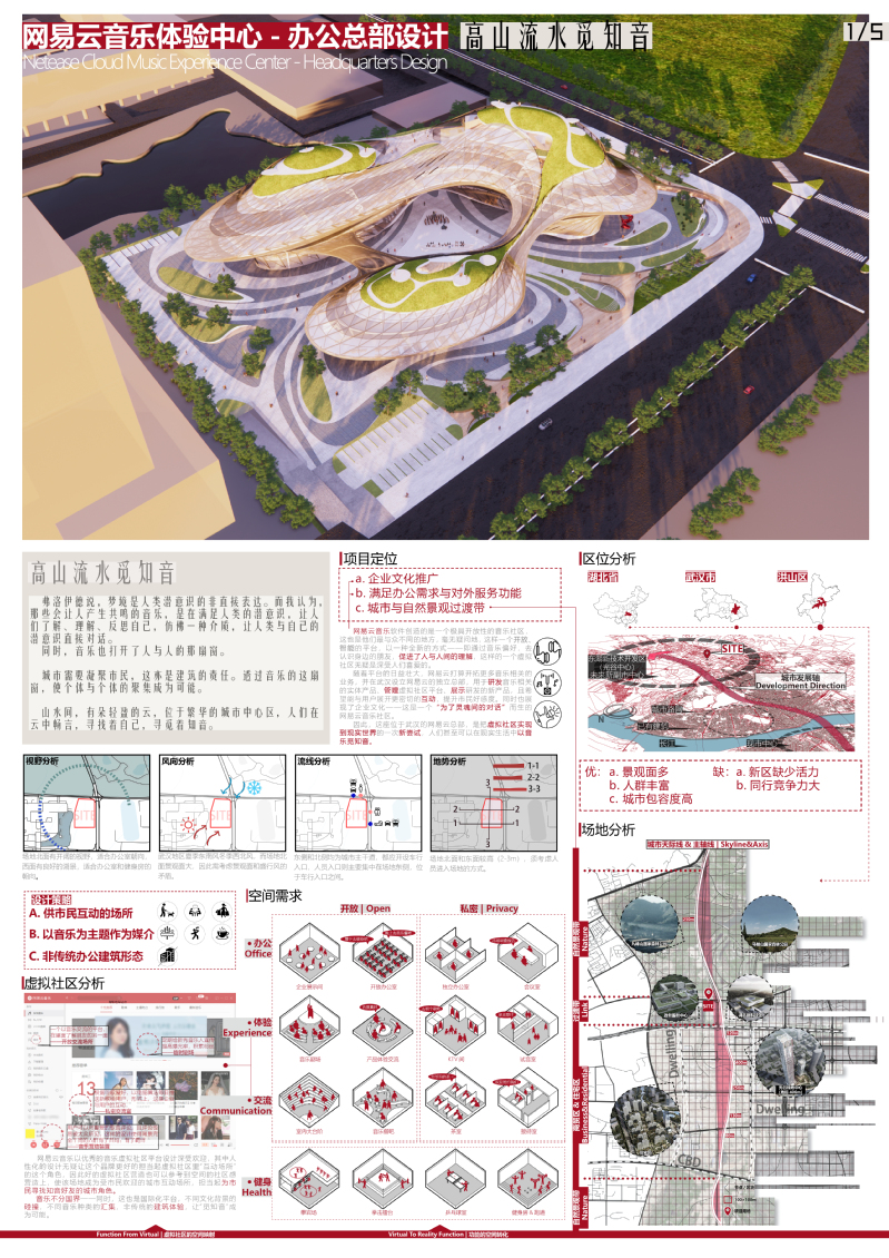 高山流水觅知音,是《高山流水觅知音——网易云音乐体验中心办公总部设计》传递的概念,也是它希望描绘的意境。该设计是网易云音乐的第二总部,位于武汉市东湖高新区。网易云音乐以创新的音乐平台社区形式深受用户喜爱,该设计以网易云企业特色为出发点推敲功能空间,再从得到的建筑形态探索空间的潜能。同时,关注城市发展与办公建筑的联系,希望打破当今办公建筑的固有印象:高度集约、失去了城市的归属感。它将以一个轻盈柔和的姿态,坐落在九峰山的山脚下,是一个产生共鸣的场所,一个城市的关怀者,更是一个企业的标志。