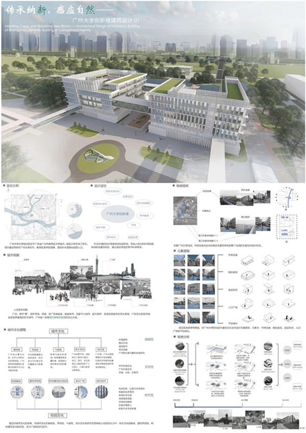 创新楼位于广州大学校内,为尊重和传承当地的历史与现有的校园文脉,在建筑平面的布局上延续传统的围合庭院式布局,并对其进行有利于解决西晒的建筑外表皮的创新。在庭院空间的设计中一种是通过对“庭院”空间和“风景园林”景观空间的抽象和提炼融合,将这两种特色的景观融汇贯通,另一种是以阶梯式花园廊桥连接庭院两侧不同楼层,在庭院的上空悬置了一份独特的观赏和游戏体验。围合空间的形体本身被赋予两种性格,一种沉稳厚重,表达广州大学厚重的历史底蕴;一种轻盈飘逸,表达当下时代新的教学理念和轻松学习氛围。两种性格相互映衬、对撞,又和谐统一。