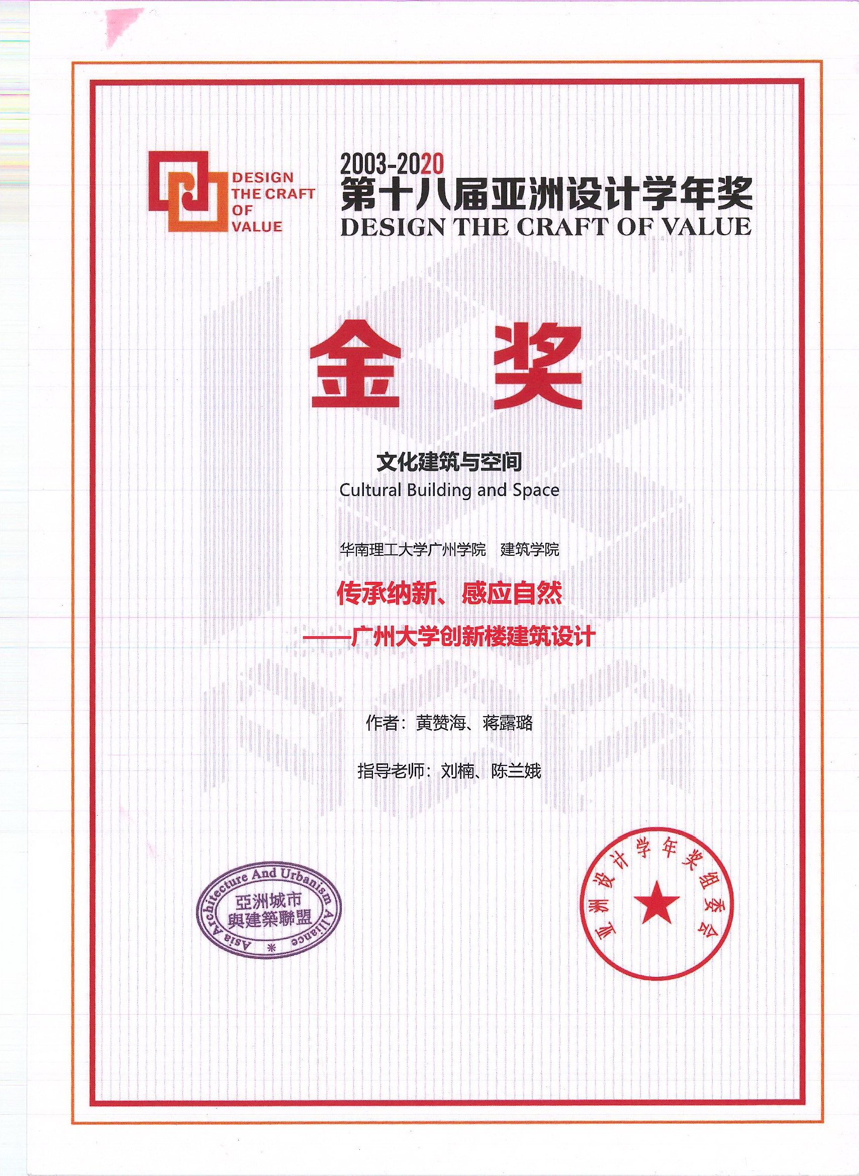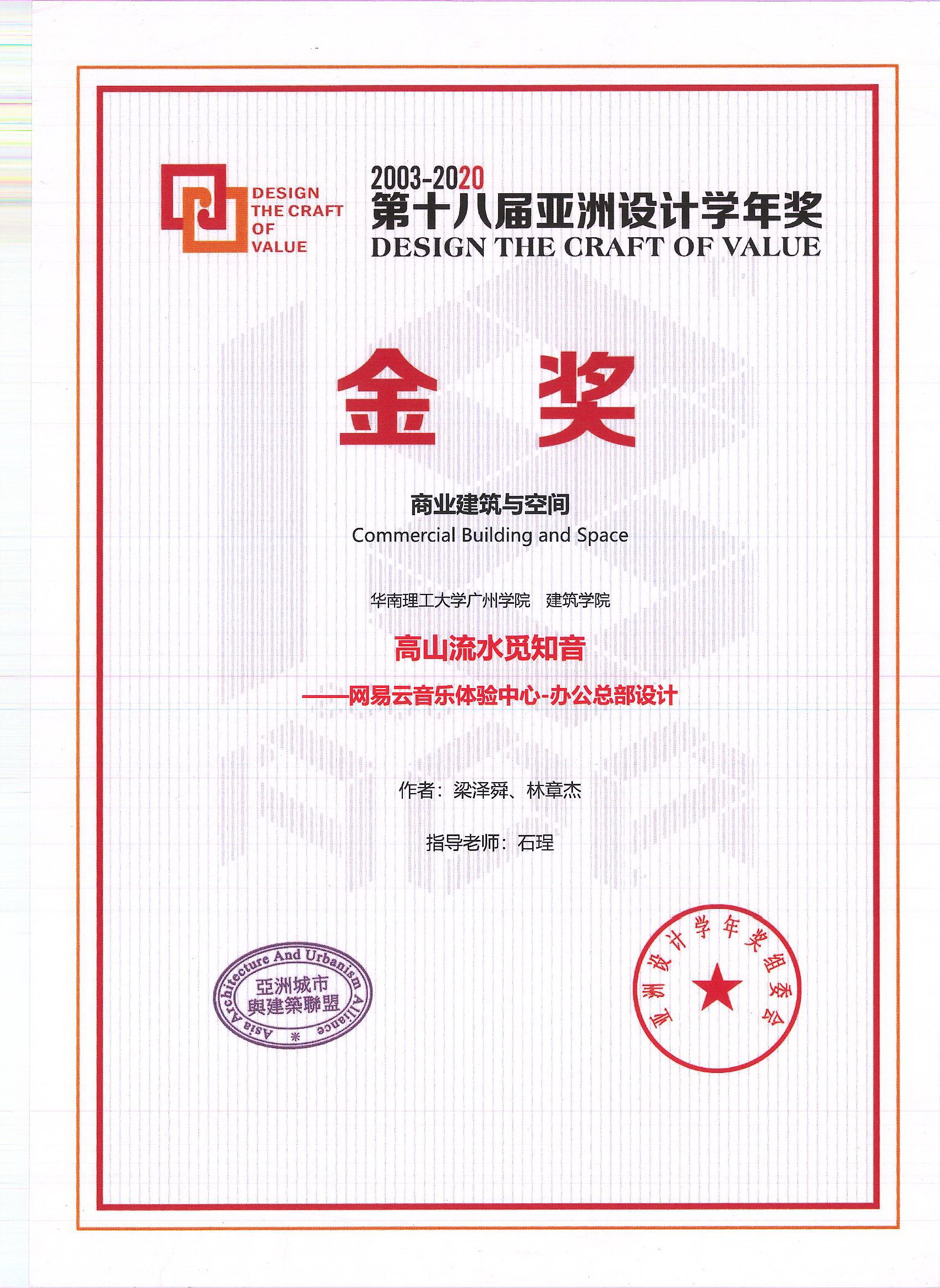 亚洲设计学年奖由亚洲城市与建筑联盟、亚洲设计学年奖组委会主办,是国内高校环境设计领域最高奖项。2020年该赛事吸引了爱丁堡大学、清华大学、同济大学、哈尔滨工业大学、东南大学、华南理工大学等国内外近400所高校参与。我校建筑学院石珵老师指导,梁泽舜和林章杰同学的参赛作品《高山流水觅知音——网易云音乐体验中心办公总部设计》获得“商业建筑与空间类”金奖;刘楠、陈兰娥老师指导,黄赞海和蒋露璐同学的参赛作品《传承纳新、感应自然——广州大学创新楼建筑设计》获得“文化建筑与空间类”金奖;石珵、区文谦、刘楠、陈兰娥获得优秀指导教师奖。据悉,参赛获奖者将被纳入亚洲城市与建筑联盟设计人才库,这也是建筑学院连续2年在该赛事中获得2个金奖。