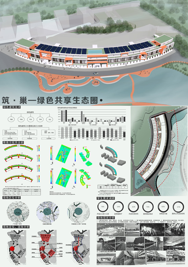 作品《筑·巢——绿色共享生态圈》为朵朵、陈芷筠、李冰老师指导,由建筑学专业靳欣、杨紫媚、谢浩源、马健俊、肖永锋等同学共同完成。该设计将绿色生态可持续理念融入到商业街改造方案设计中,为大学生提供一个学习休闲娱乐的场所,达到丰富功能空间和活化周边场地的效果,方案提出“巢穴”的概念,将缺失的功能通过鸟儿筑巢的方式补充到原建筑中,因此在建筑过程中采用了透水砖和渗透绿地收集雨水,收集的雨水可再次利用,局部还采用了种植屋面和垂直绿化、太阳能光伏板等绿色技术来达到节能减排的目的。
