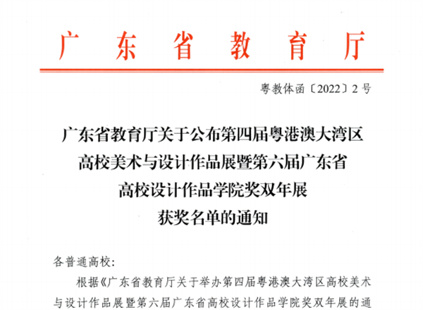 本网讯(记者 孙园 梁光勇 李江煜 林杰 李雨倩)1月29日,广东省教育厅公布了第四届粤港澳大湾区高校美术与设计作品展暨第六届广东省设计作品学院奖双年展获奖名单,我校师生作品分别获“设计作品奖”二等奖1个、三等奖1个、优秀奖3个。