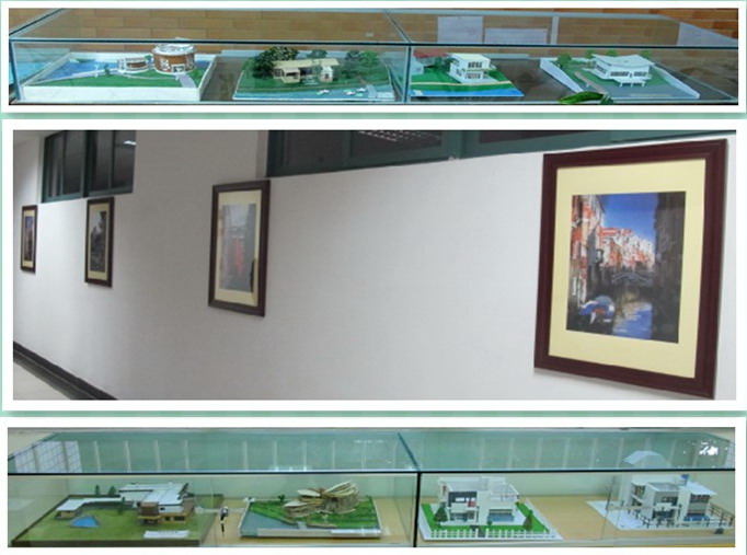 根据建筑学专业评估标准相关规定,学院不断完善教学基础设施,为每位学生配备专用制图桌凳,配齐了美术画架等教学用具,保障了专业课程教学的顺利进行。在A10一楼精心布置展览评图厅,为学生作业展示、教师评图、师生交流及建筑模型展览等提供了条件。同时有针对性地摆放中国古代建筑瑰宝应县木塔、斗拱等建筑模型,在走廊通道等地悬挂布置建筑作品画等,激发学生对建筑空间构成的思维灵感。